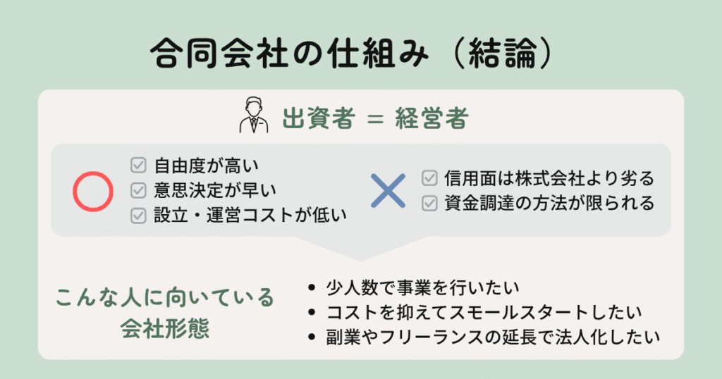 合同会社は「低コストで設立でき、自由度高く経営できる会社」とイメージすると分かりやすいです。