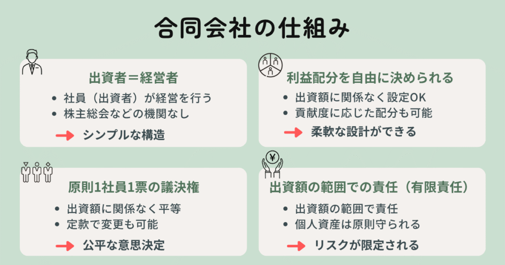 合同会社の特徴を理解するには、次の2つのポイントで捉えるのが重要です。