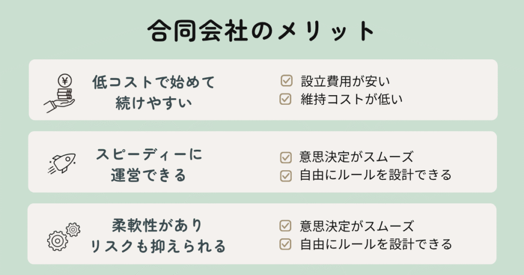 また、設立費用やランニングコストを比較的低く抑えられるため、初期コストを抑えて事業を始めたい場合にも向いています。