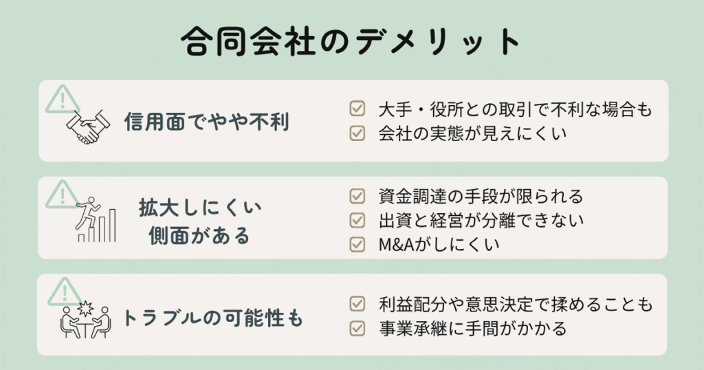 一方で、株式会社と比べると認知度や信用面で不利になる場面や、資金調達の方法が限られるといった側面もあります。