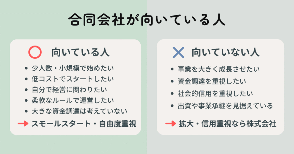 「少人数で自由に事業を行いたい人」や「スモールスタートを考えている人」に向いている会社形態です。