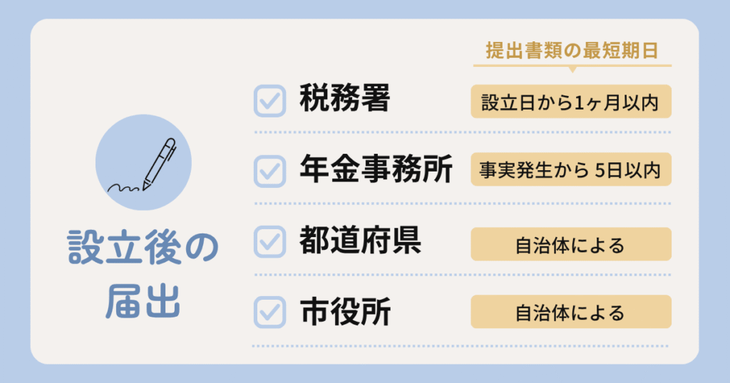 また、設立後には一定の期限内に税務署や年金事務所、自治体への届出が必要となるため、あらかじめスケジュールを把握しておくことが重要です。