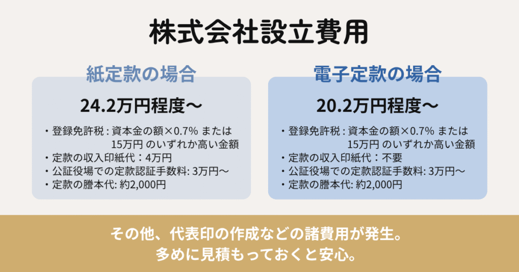 費用については、最低でも約20万円〜25万円程度かかり、電子定款を利用することで一部を節約することもできます。
