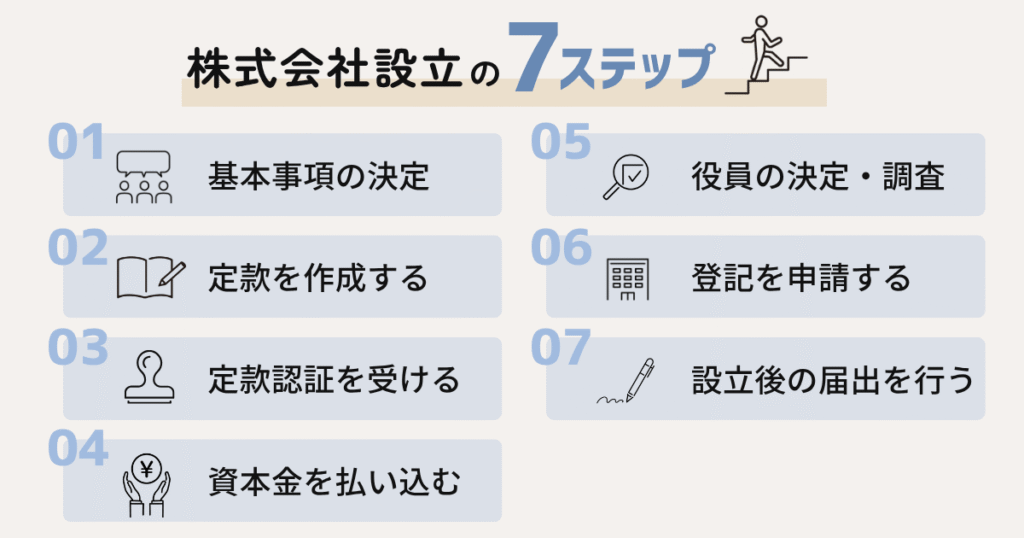 • 事前準備から設立後の届出までを含めた7つのステップ