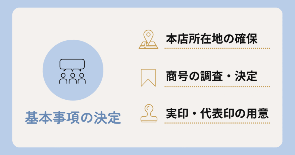 これらの内容は定款や登記に必要となるため、あらかじめ整理しておくことで、その後の手続きをスムーズに進めることができます。