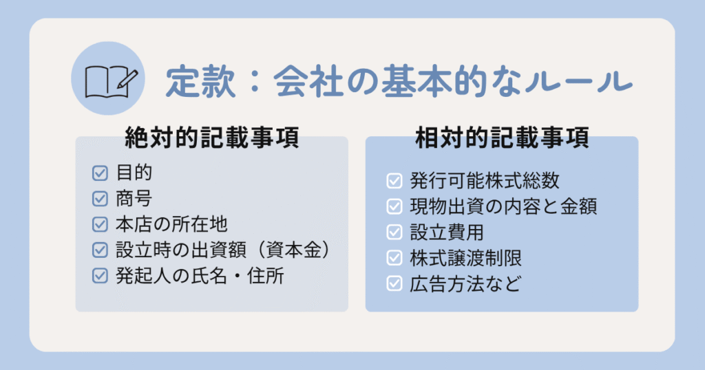 会社法では、必ず記載しなければならない「絶対的記載事項」と、記載は任意であるものの、定めなければ効力が認められない「相対的記載事項」などが定められています。