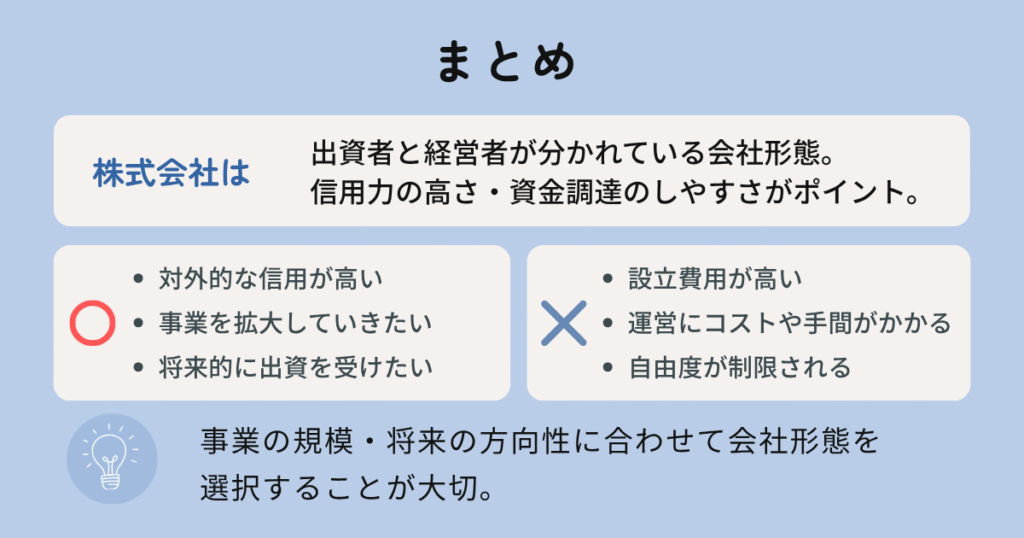 ここまで見てきたとおり、株式会社は信用力や資金調達のしやすさなどのメリットがある一方で、コストや手間がかかるという特徴があります。