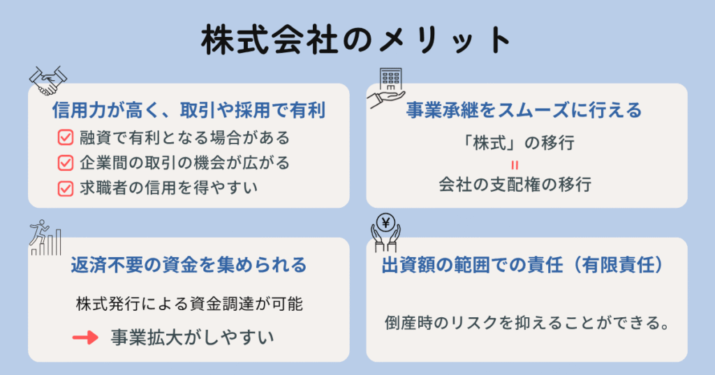 株式会社を設立して事業を行う主なメリットは、次の4つです。